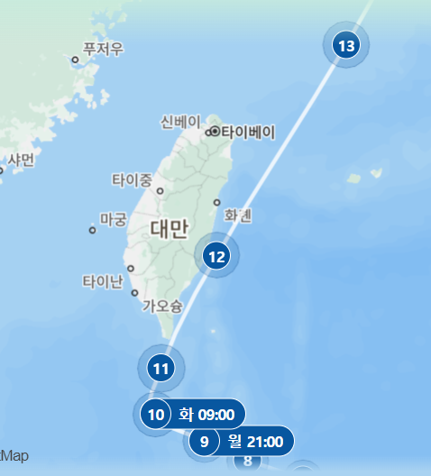 ⑩ 화(10월1일) 09 : 00 타이완 타이베이 남남서쪽 약 480km